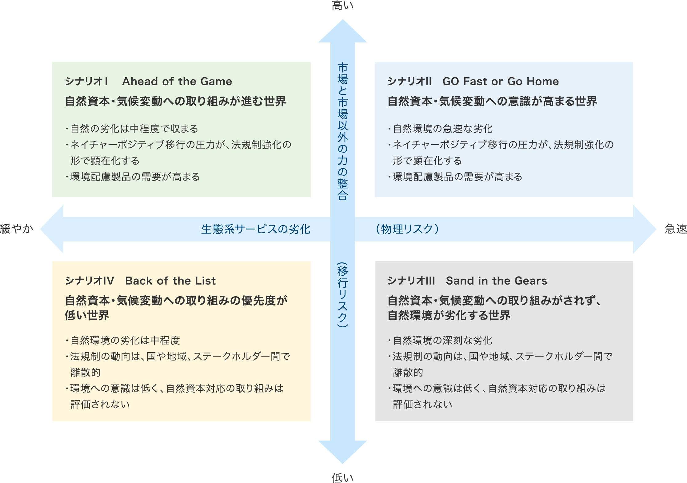 重要性の評価にあたっては、TNFDが推奨するシナリオに沿って、生態系サービスの劣化(物理リスク)と市場と市場以外の力の整合(移行リスク)の2軸で描かれた4つのシナリオを想定し、それぞれのリスクおよび機会の強度(財務影響度)と発生可能性の観点から評価しました。