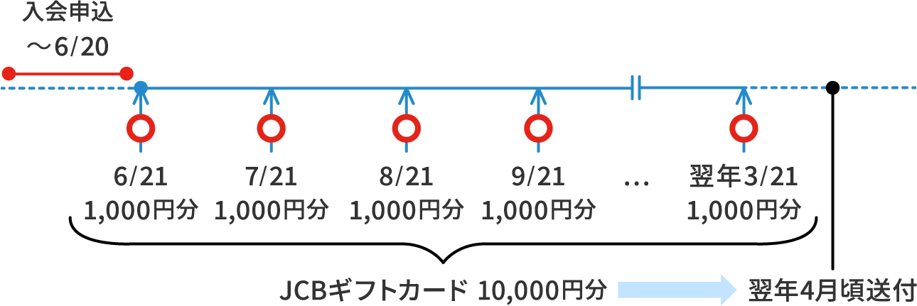 →10,000円分のJCBギフトカードを進呈(6月~翌年3月の10ヵ月×1,000円)