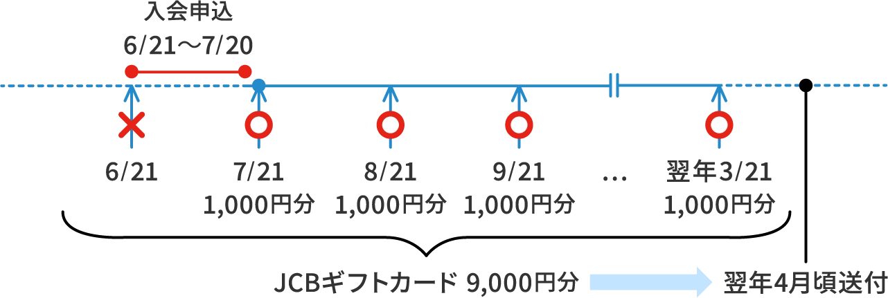 →9,000円分のJCBギフトカードを進呈(7月~翌年3月の9ヵ月×1,000円)