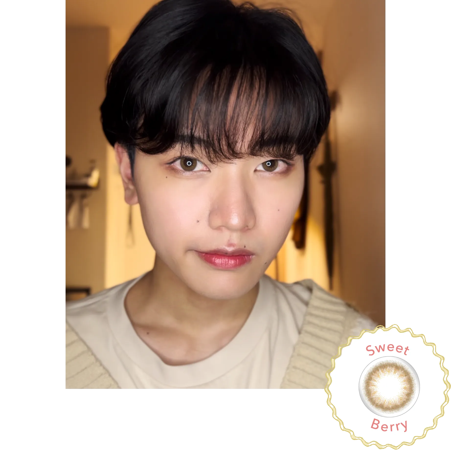 この2つが、カラコンが演出する印象に差をつけます。もちろん、自分のなりたいイメージに合わせるのがいいと思いますが、ぼくの場合は着色外径が大きすぎず、色味も派手すぎないものを選ぶようにしています。着色外径は14mm以上になると大きく感じますね。カラーはブラックや深いブラウンなど暗めのものが、自然に盛れておすすめです。