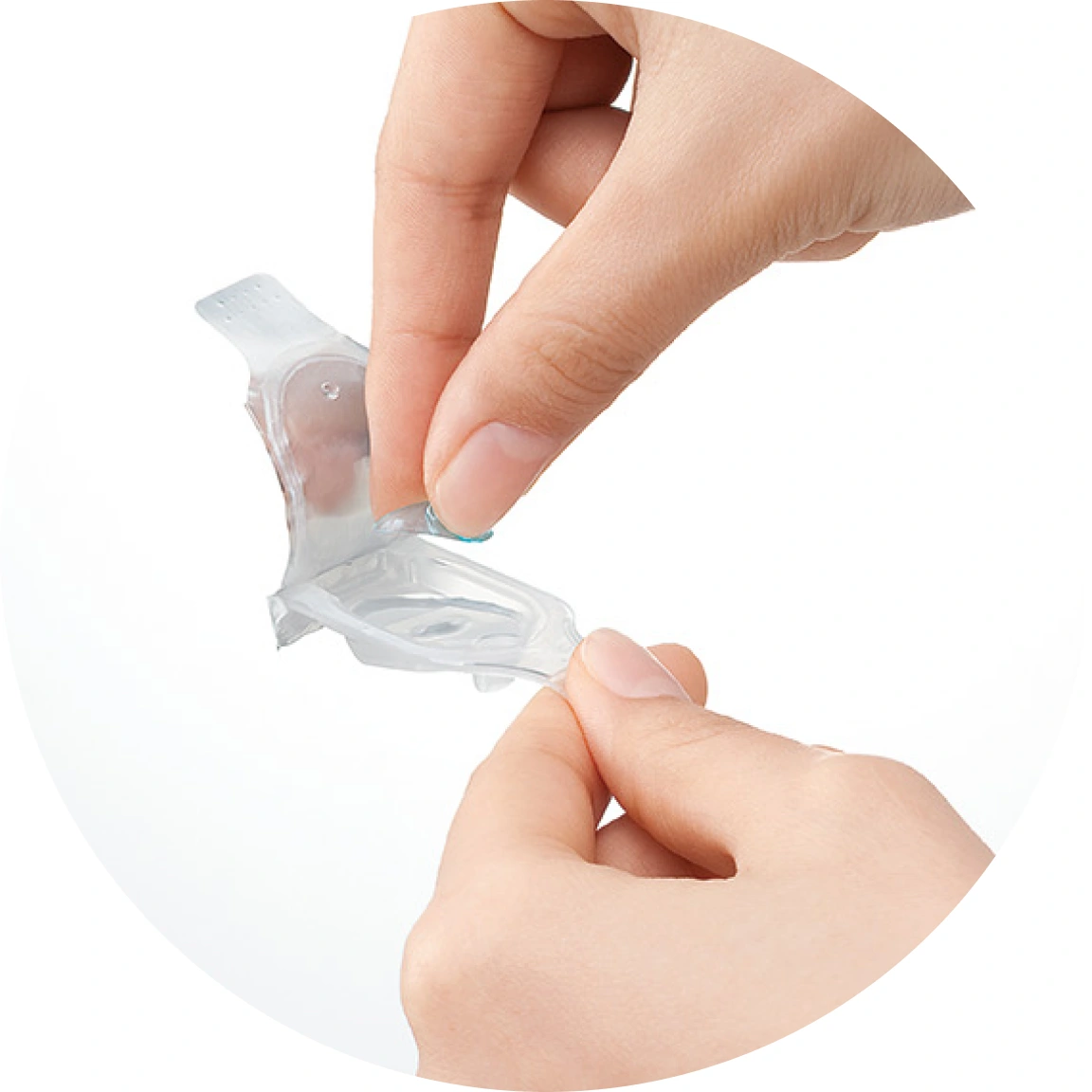 コンタクトレンズの内側が下向きで収納されているため、内側にふれることなく、裏表も確認不要で簡単・清潔に装着できます。
